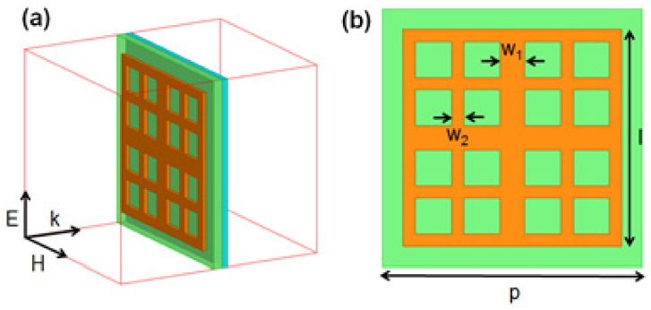 그림 1(a)에서와 같이 배면이 도체로 단락된 유전체 기판 위에 그리드 형태의 도체 패치가 주기적으로 배열된 구조를 취한다. 단위 셀 및 그리드 도체의 크기는