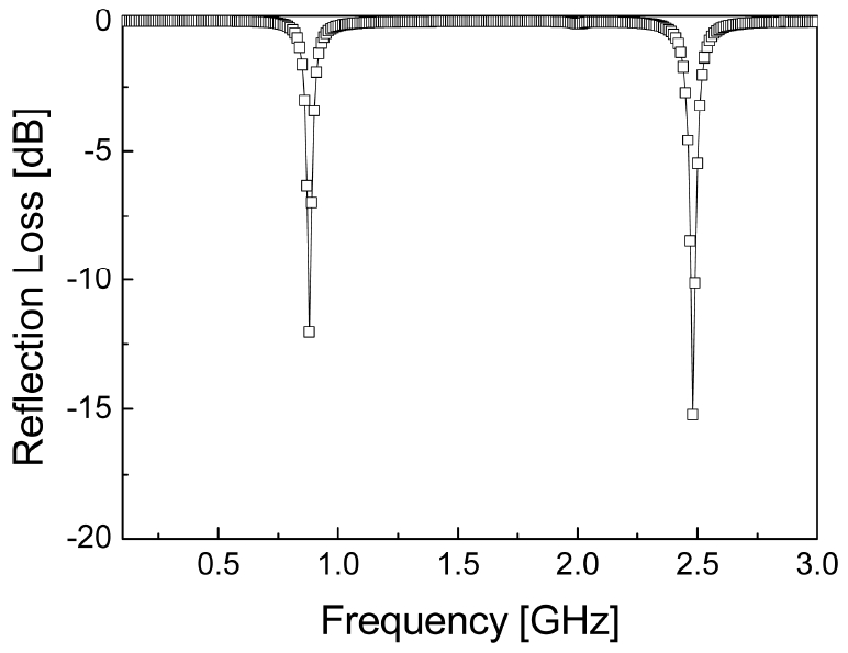 단위 셀 및 그리드 도체의 크기를 표 1에서와 같이 변화시켰을 때, 치수 D (p = 100 mm, l = 73 mm, w1 = 9.0 mm, w2 = 4.5 mm, ts = 3.75 mm, tm = 0.015 mm)에서 가장 좋은 결과를 얻을 수 있었고, 그 결과를 그림 2에 나타내었다. f1= 0.88 GHz에서 –12 dB, f2 = 2.48 GHz에서 –15 dB의 반사손실을 보인다. 단위 셀의 크기를 p = 95mm로 줄였을 경우 (치수 A), 주파수 대역이 각각 f1 = 1.0 GHz, f2 = 2.78 GHz로 증가하여 목표 주파수 대역에서 벗어난다. 기판의 두께가 ts= 3.25 ~ 3.50 mm로 작은 경우 (치수 B, C), 반사손실이