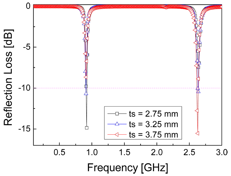 상기 최적 설계치 (그림 2)는 GPMA 파라미터 각각에 대해 치수 변화에 따른 반사손실을 시뮬레이션 하여 얻어진 결과이다. 일례로 그림 3은 GPMA의 치수가 다음과 같이 주어지고 (p = 86.5 mm, l = 70 mm, tm = 0.02 mm, w1 = 4.4 mm, w2 = 8.8 mm), 유전체 기판의 두께를 ts = 2.75, 3.25, 3.75 mm로 변화시켰을 때, HFSS 상용 툴을 이용하여 시뮬레이션한 반사손실 그래프이다. 0.91 GHz 와 2.64