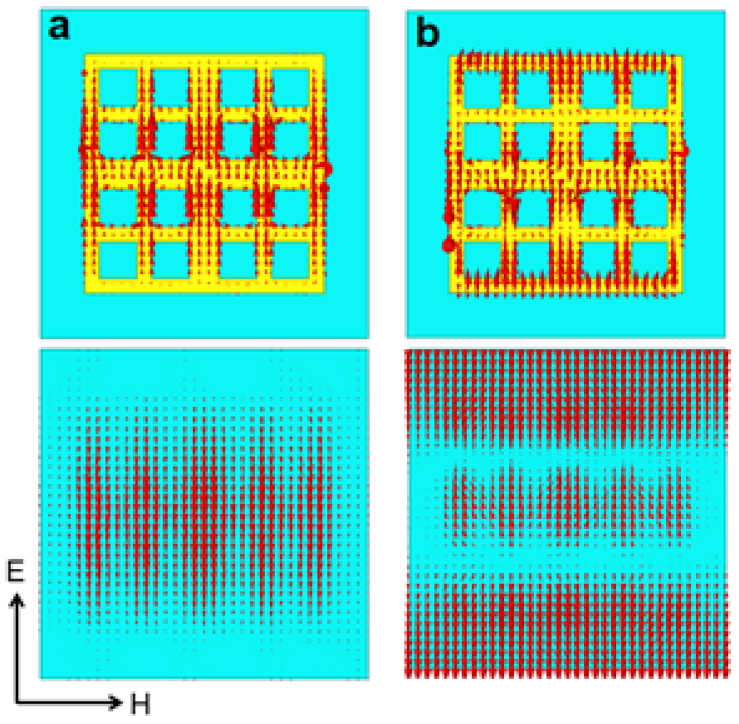 보인다. 따라서 그리드 도체−배면 접지 도체 쌍은 하나의 자기공진기로 취급될 수 있다(그림 4(a)). 둘째 흡수 피크가 나타나는 2.48 GHz에서는 그리드 도체의 상, 중, 하에서 서로 반대 방향의 전류가 흐르고 있다 (그림 4(b)). 배면의 접지면에서는 상, 중, 하 부분에서 그리드 도체와는 서로 반대 방향으로 전류가 흘러 외부 자계에 대한 자기공진 반응을 보인다. 따라서