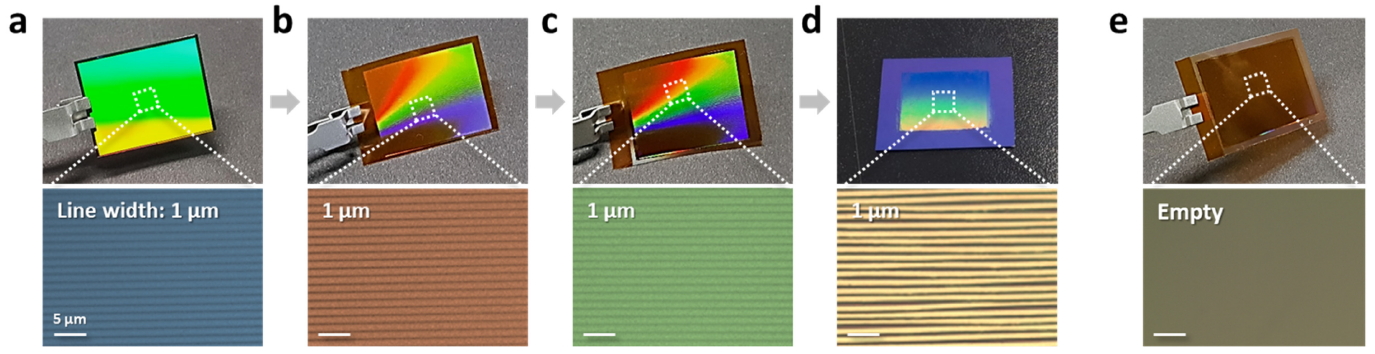 그림 2는 패턴전사프린팅 공정을 보다 상세하게 나타내주는 사진 및 광학현미경 (Optical Microscope, OM) 이미지이다. 마스터 패턴 (그림 2a)로부터 얻어진 PMMA 복제 폴리머 패턴 (그림 2b) 상에 Pt 소재가 증착되고 (그림 2c), 이를 SiO2/Si 기판 위 프린팅 하였다 (그림 2d). 그림 2e와 같이, 패턴을 전사하고 난 후에는, PI 접착성 필름상에는 아무것도 남지 않게 된다. 즉, PMMA 복제패턴은 Pt 패턴이 기판 위에 성공적으로