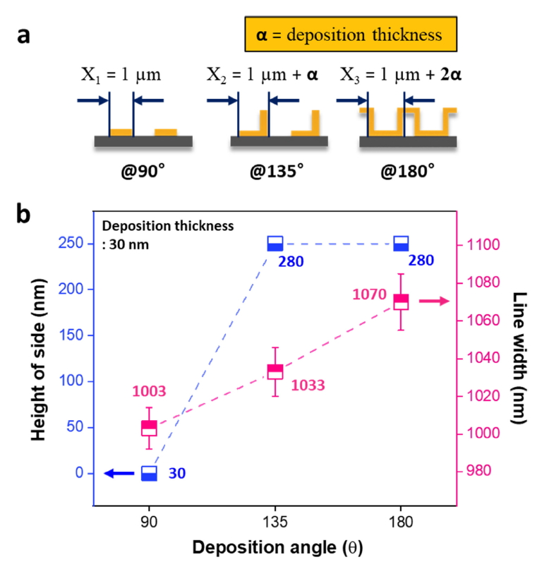 형성된다 (그림 4a). 예를 들어, 증착된 두께가 50 nm라고 가정한다면, θ가 135°인 경우에는 1.05 μm 선 폭 및 200 nm 선 간격을 갖는 L 모양의