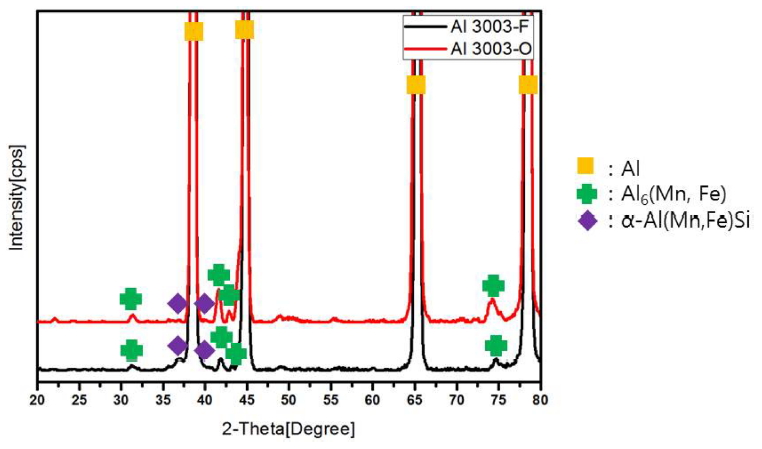 F ์ O ์์ฌ์ XRD ์ ๋ถ์ ๊ฒฐ๊ณผ๋ฅผ ๊ทธ๋ฆผ 3์ ์ ์ํ์๋ค. F, O ๋ ์์ฌ ๋ชจ๋ Al ๊ธฐ์ง, Al6(Mn,Fe) ๊ทธ๋ฆฌ๊ณ ฮฑ(AlMnFeSi) ์์ผ๋ก ๊ตฌ์ฑ๋์ด ์์๋ค. ์ผ๋ฐ์ ์ผ๋ก Al6(Mn,Fe) ์ ๋ฐ ฮฑ(AlMnFeSi) ์์ Al-Mn ๊ณ ํฉ๊ธ์์ ๊ฐํ์ ์ญํ ์ ์ํํ๋ค๊ณ ์๋ ค์ ธ ์๋ค. ์ด๋ฌํ ๊ฐํ์๋ค์ XRD ํผํฌ ๊ฐ๋(intensity)
