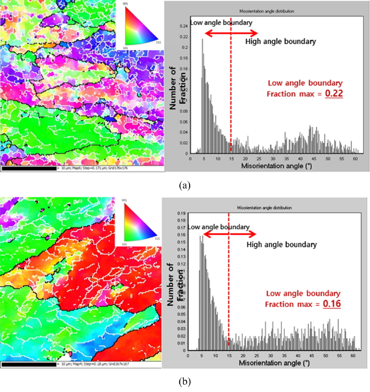 ๋นํด ํ์ฐํ ๊ฐ์ํ ๊ฒฐ๊ณผ(a,c)๋ฅผ ๋ณผ ์ ์์ผ๋ฉฐ, misorientation angle ๋ถ์จ ๊ฒฐ๊ณผ์์๋ F(max ์ฝ 0.22)์ ๋นํด ๊ฐ์(max