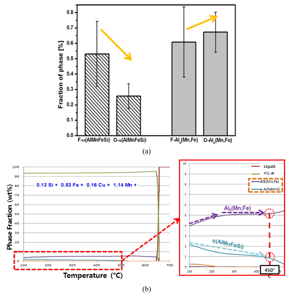 ์ด์ฒ๋ฆฌ ์ดํ ฮฑ(AlMnFeSi) ์์ ๋ถ์จ์ ๊ฐ์ํ๊ณ Al6(Mn,Fe) ์๋ถ์จ์ ๋ค์ ์ฆ๊ฐํจ์ ์ ์ ์์๋ค. ์๊ธฐ ๊ฒฐ๊ณผ๋ ์์ XRD ๋ถ์(ํผํฌ ๊ฐ๋) ๊ฒฐ๊ณผ๋ฅผ ํตํด ์ ์ถํ ์ ๋ถ์จ ๊ฒฐ๊ณผ(๊ทธ๋ฆผ 3)์๋ ์ผ์นํ๋ ๊ฒ์ด๋ค. ์ด์ ๊ด๋ จํ์ฌ ๊ทธ๋ฆผ 8(b) Factsage phase simulation program์ ์ด์ฉํ ์ ๋ถ์ ํด์ ๊ฒฐ๊ณผ์์๋ ์จ๋๊ฐ ์ฆ๊ฐํจ์ ๋ฐ๋ผ ฮฑ(AlMnFeSi) ์ ๋ถ์จ์