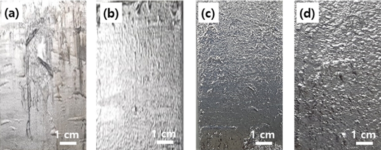 그림 2(a)-(d)는 서로 다른 조성을 갖는 Zn계 합금도금 강재의 외관을 나타낸다. 도금욕 제조 시 용융 Zn에 첨가되는 Mg 및 Al의 함량이 증가함에 따라 도금욕