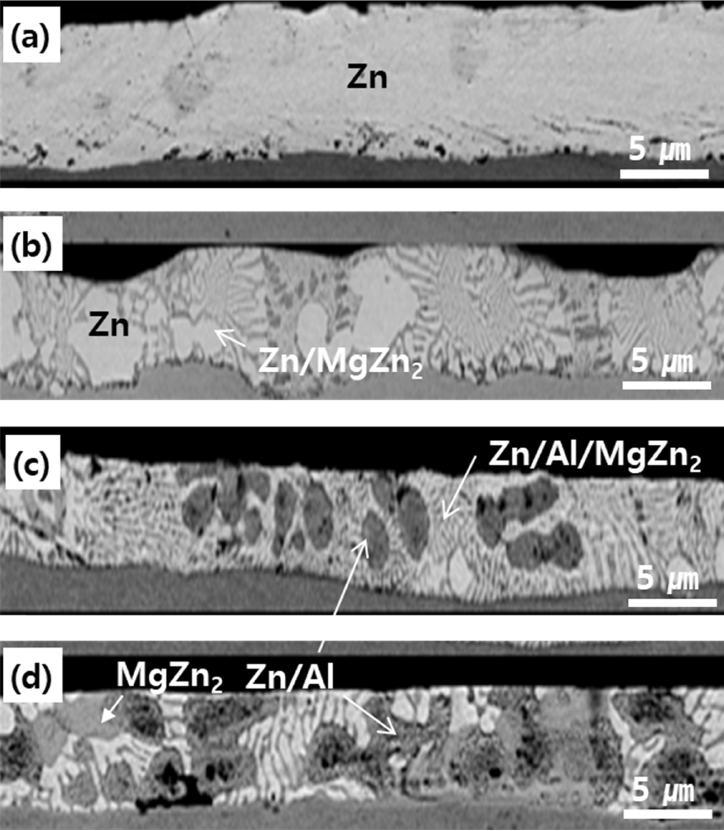 그림 3(a)-(d)는 Al과 Mg 조성 변화에 따른 Zn계 합금 도금층의 FE-SEM 단면 사진을 나타낸다. 그림에 나타낸 바와 같이 100% Zn으로 이루어진 Zn