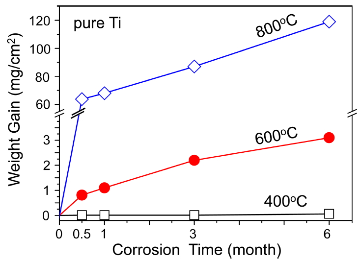 For comparison, titanium was subjected to the same oxidation conditions given in Fig 3, and the weight gains due to oxidation were measured as shown in Fig 4. Each data point was obtained from one sample. Titanium oxidized quite slowly at
