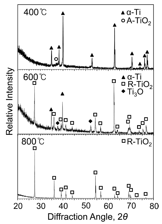 For comparison, titanium was oxidized under the same conditions given in Fig 5, and XRD data were acquired, as shown in Fig 6. When oxidized at 400 °C, strong α-Ti matrix peaks and a faint anatase-TiO2 peak were detected, indicating that oxidation progressed so slowly that a superficial