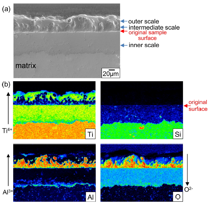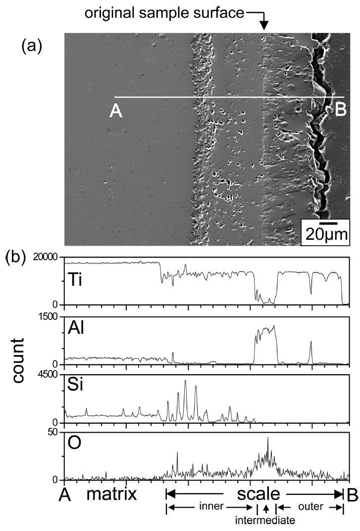 formation of the inner TiO2 scale. It is noted that TiO2 grew by either outward diffusion of interstitial Ti4+ ions or inward diffusion of O2- ions via oxygen vacancies [29]. The outer oxide layer grew by outward diffusion of Ti4+ ions plus a small amount of Al3+ ions, the intermediate oxide layer grew by outward diffusion of Al3+ ions plus a small amount of Ti4+ ions, and the inner oxide layer containing some SiO2 grew by inward diffusion of O2- ions.