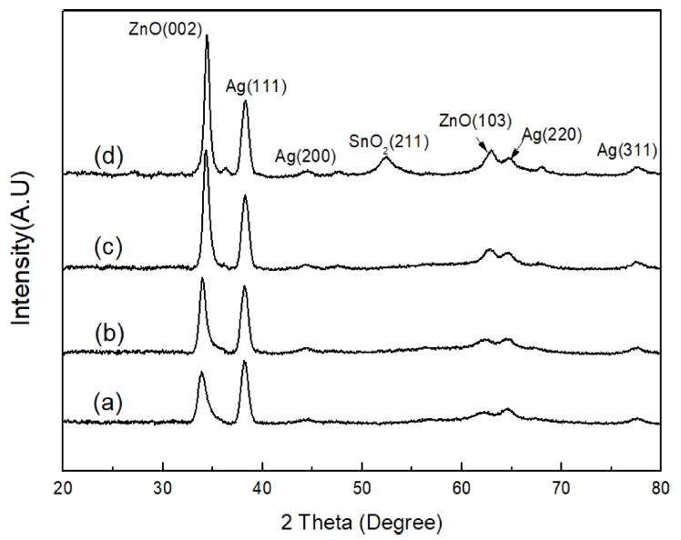 Figure 2 shows the XRD patterns observed from the ZAS tri-layer films as a function of electron