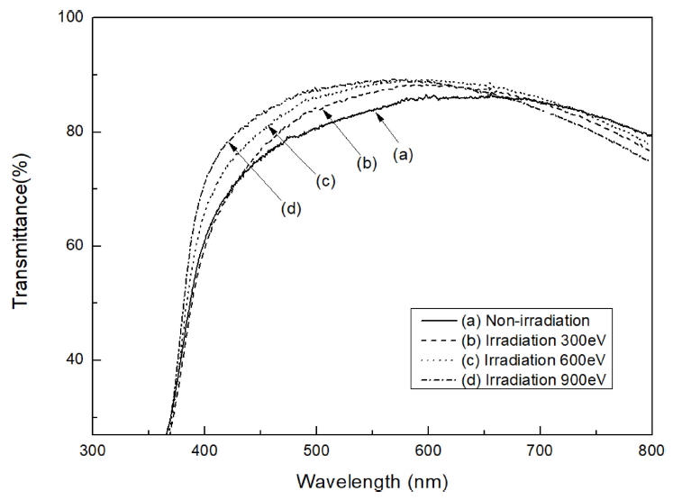 films electron-irradiated at 900 eV showed an increased average visible transmittance