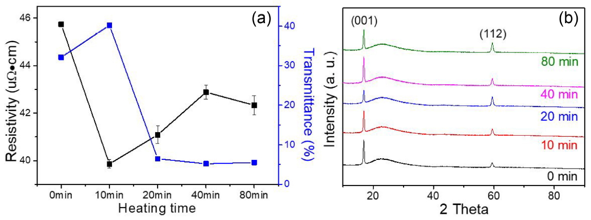 그림 1(a)에 정리된 바와 같이, co-sputtering을 진행 후, 유지열처리를 실시했을 시, 투과도와 비저항의 값은 10 min에서 투과도가 40.2%로