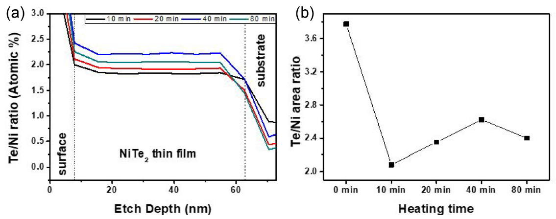 그림 2(a) Etch depth에 따른 Te/Ni ratio 변화를 보면, 10 min 열처리 조건은 다른 조건 대비 내부와 비슷한 ratio를 유지하고 있지만