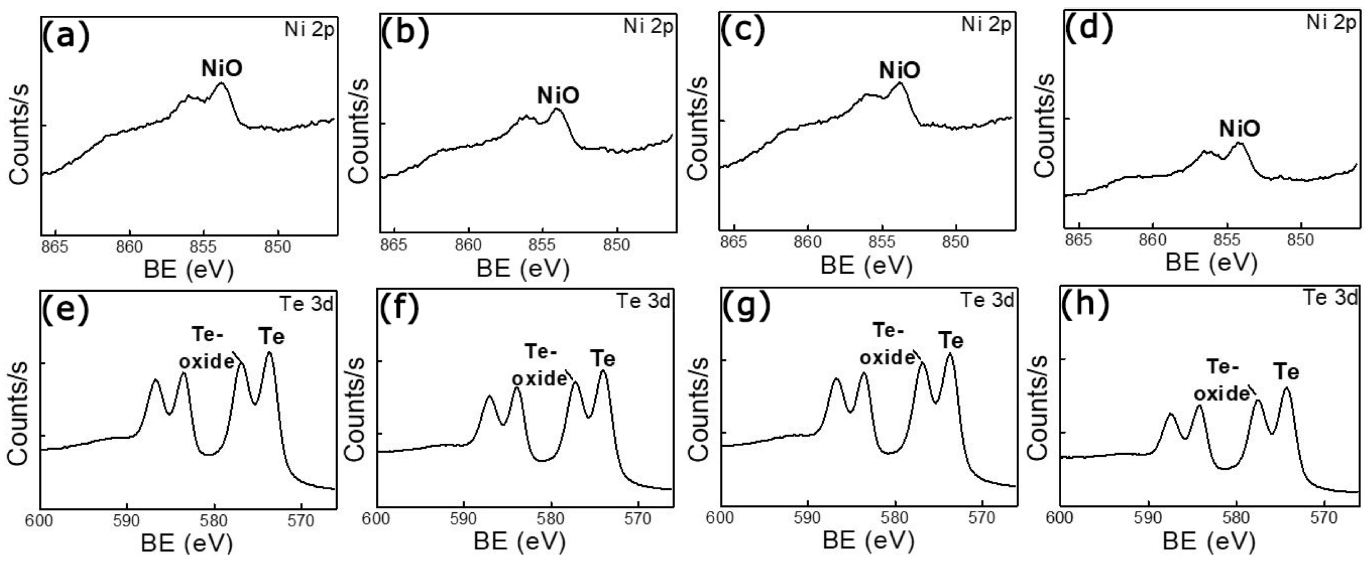 보여진다. 그리고 그림 3(e)~(h)에서 보듯이 박막 표면에서 Te의 BE는 Te의 peak 이외에 Te oxide의 peak이 같이 확인되었으며, 이것은 Ni와 마찬가지로 박막 표면의