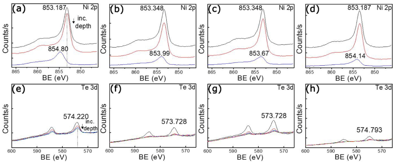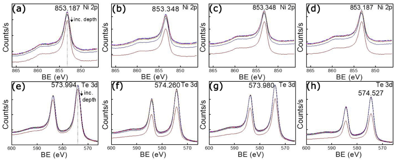 그림 5는 기판 부근에서 증가하는 depth에 따른 Ni 2p와 Te 3d BE를 보여준다. 그림 5(a)~(d)에서의 Ni는 기판부근에서는 NiTe2의 BE라고 생각되는 853.187 eV을 유지하다가 기판 쪽으로 가면서 Ni와 O의 결합으로 NiO의 BE인 853.7 eV 부근으로 peak이