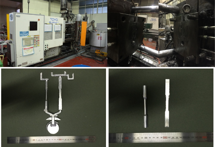 700 °C의 온도에서 용해한 뒤 그림 1에 나타낸 125톤 규격의 다이캐스팅 장비(BD-125V5 EX, TOYO)를 이용하여 고압 다이캐스팅(HPDC)공정을 통해 그림 2와 같은 ASTM-E8 규격의 시편을 제조하였다. 다이캐스팅 시편 제조 시의 금형 예열 온도는 200 °C, 슬리브 내부 직경은 40 mm, 플런저