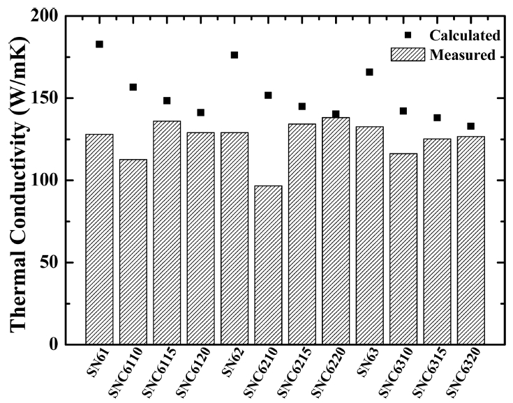 예측은 기계적 특성과 동일한 방식으로 각 상의 상온 열전도도 예측 값을 합금별로 혼합법칙을 이용해 전체 체적에 대한 예측 값을 계산한 것이다. 합금의