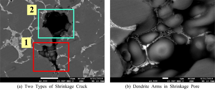 우선 본 합금에서 관찰한 결함의 종류를 그림 6에 나타내었다. 그림 6(a)의 1과 2는 모두 수축에 의한 결함으로, 1은 완전한 수축공, 2는 수축과 내부가스가 동시에 발생한 형태의 결함이다. 그림 6(b)를 보면, 돌출된 수지상 사이로 공정조직의 성장이 중단된 모습을 보이는데 이를 통해 수축공이 발생하는 근본적인 원인은 최종 응고 과정에서 잔류 액상이
