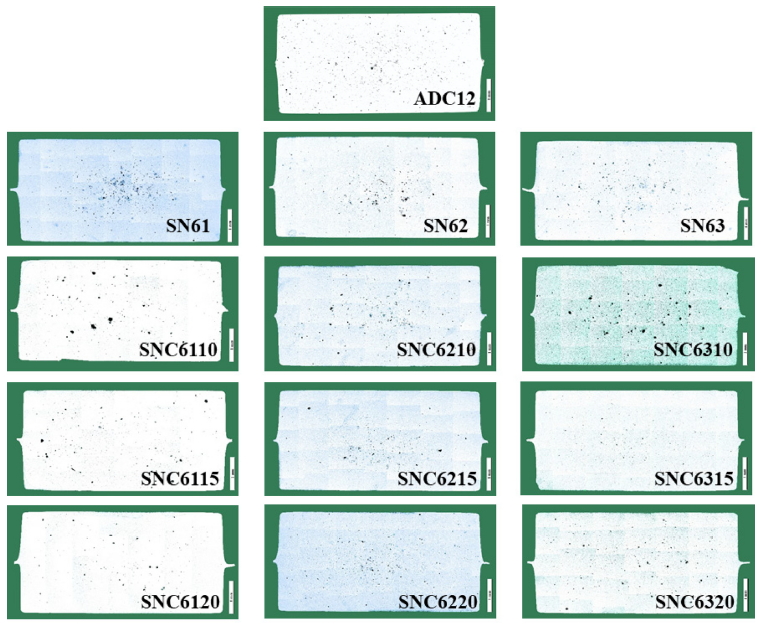 Cu를 1.0 at% 첨가한 SNC6110, SNC6210, SNC6310 합금의 경우 비교적 조대한 기공이 관찰되었는데 이는 Ravi가 보고한 바와