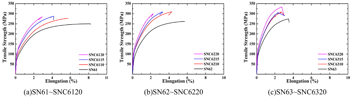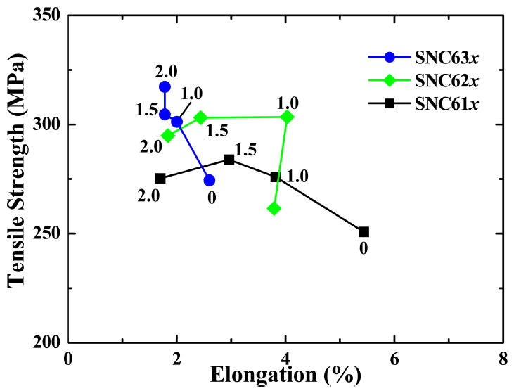 약 10 MPa, 인장강도는 40 MPa 증가하고 연신율은 2% 감소하였으며, SN63 합금의 경우(Al-6.0Si-3.0Ni)의 경우 항복강도는