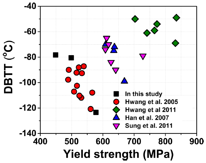 J의 흡수에너지와 -123.4 °C의 DBTT를 가져 가장 우수한 저온 인성을 나타내었다.