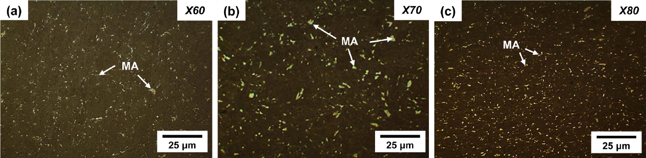 에칭을 실시한 결과 모든 강에서 페라이트와 베이나이트계 미세조직들은 갈색으로 나타나는 반면, 마르텐사이트와 MA 조직은 흰색으로 나타났다(그림 2).