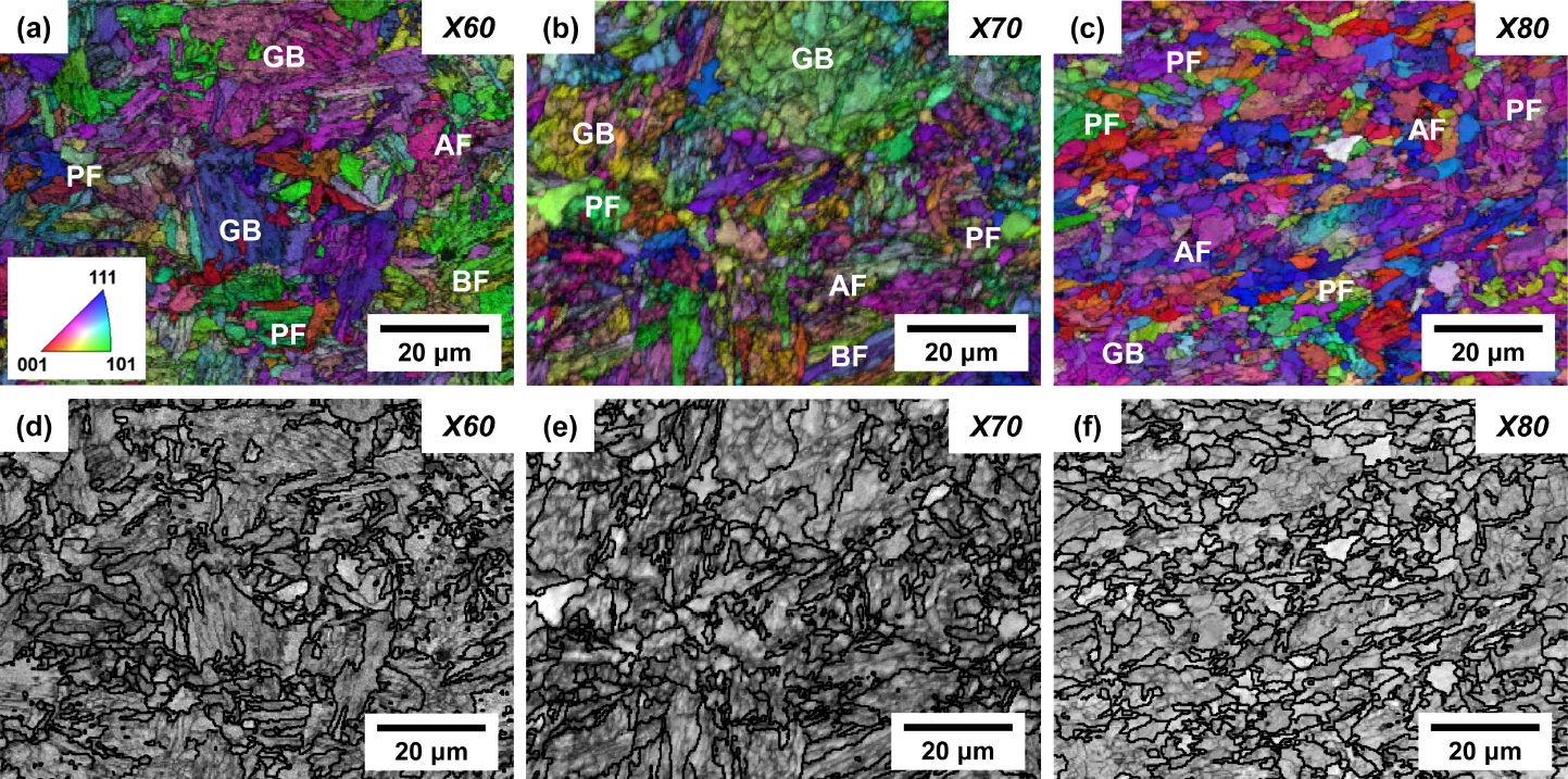 결과로부터(그림 1(d)~(f)) 모든 강들은 다각형 페라이트(polygonal ferrite, PF), 침상형 페라이트(acicular ferrite, AF), 입상형 베이나이트(granular