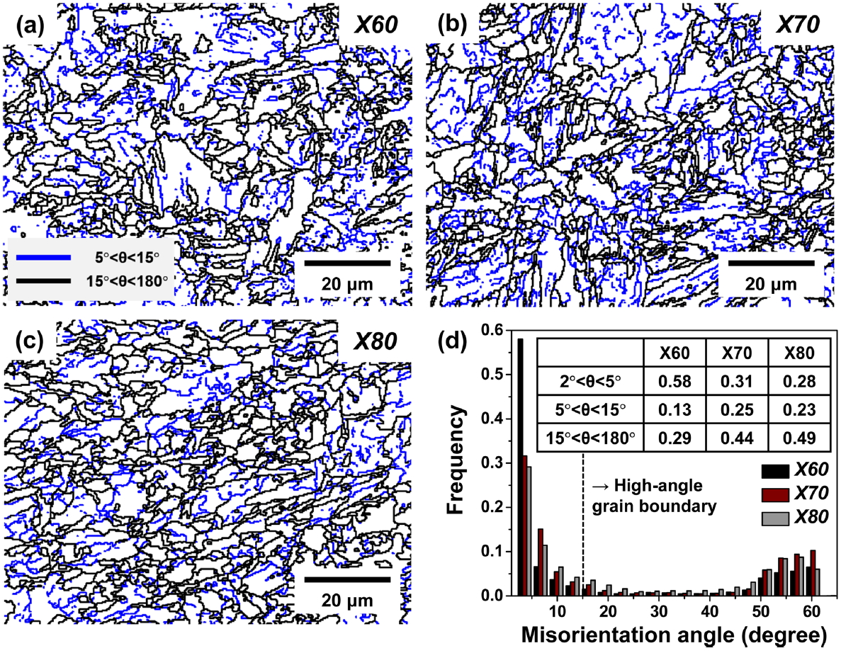 저경각계(low-angle grain boundary)가 많이 나타났다. X60, X70, 그리고 X80 강은 각각 0.42, 0.69, 그리고 0.72의