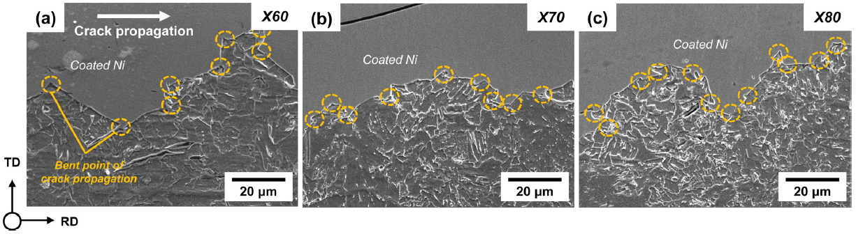 크게 관련되는데 [16-23], X80 강은 가장 작은 유효결정립도를 가지기 때문에 X60와 X70 강에 비해 미세한 벽개 파괴 크기를 나타내었다(그림 6).
