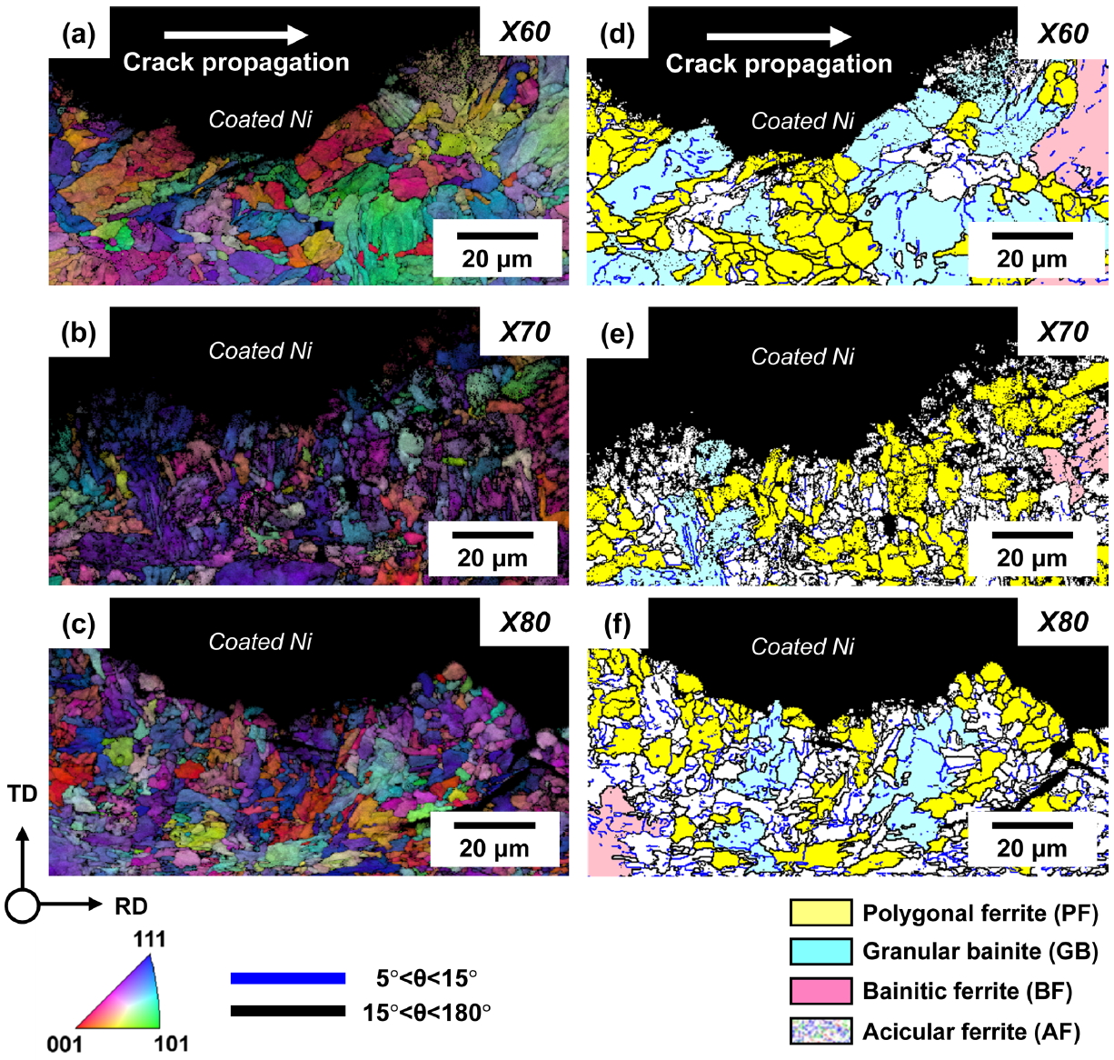 구하였다. EBSD 맵을 통해 계산된 미세조직 분율 측정 결과를 보면(표 2), 모든 강은 50~60%의 높은 AF 분율을 나타내었고, X60 강은 29.2%와 8.8%의 가장 높은 GB와 BF분율을 나타내었다. 반면 X80