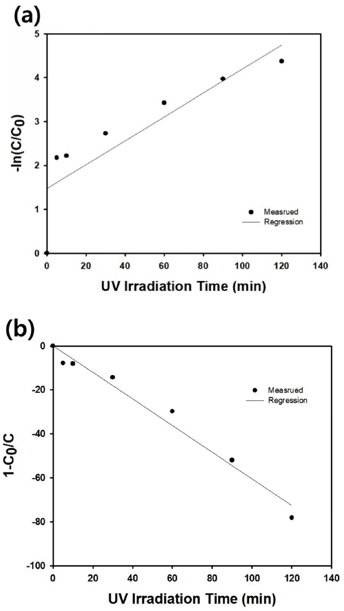 However, the interception between the regression line and ordinate (y axis) was located far from the origin, indicating that the first order kinetics is