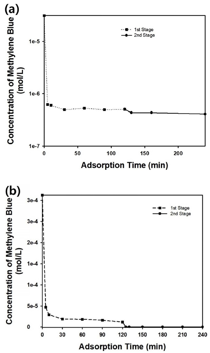 process. Figure 11(a) shows the change in methylene blue concentration during the two-stage adsorption