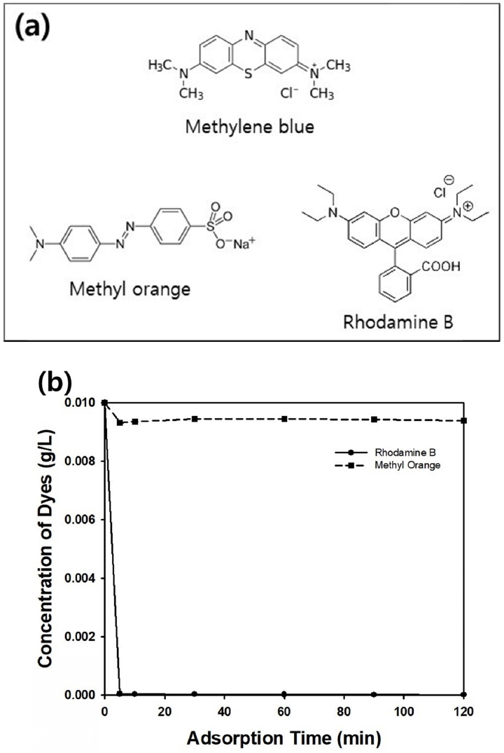 In this study, other kinds of organic dyes such as rhodamine B or methyl orange dissolved in aqueous medium were adopted for adsorption tests using