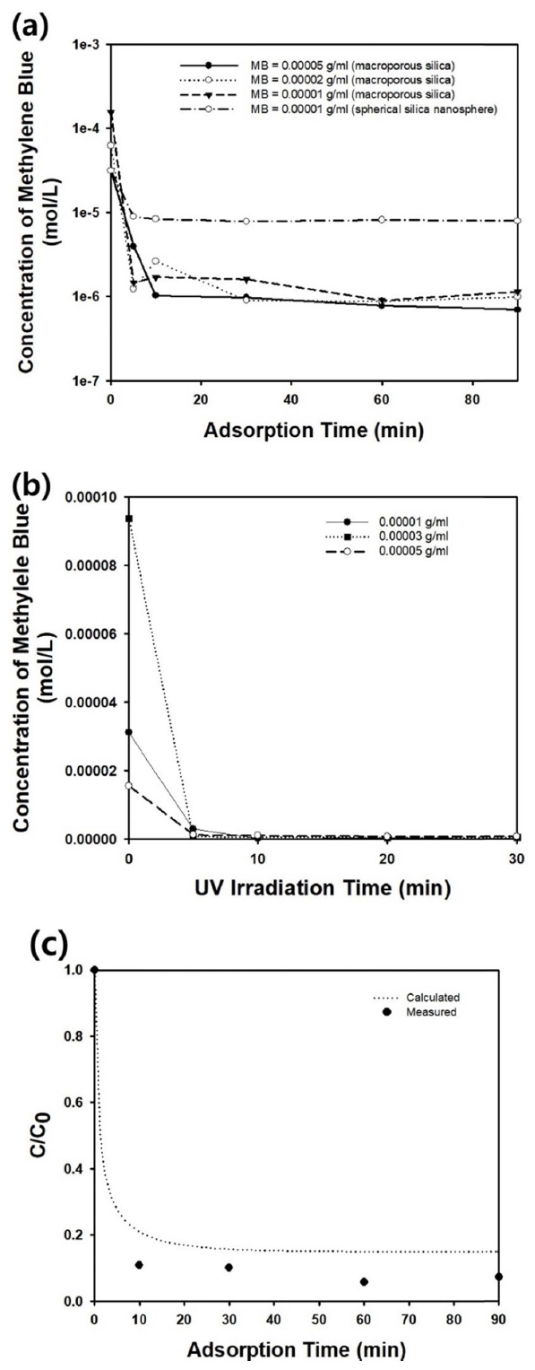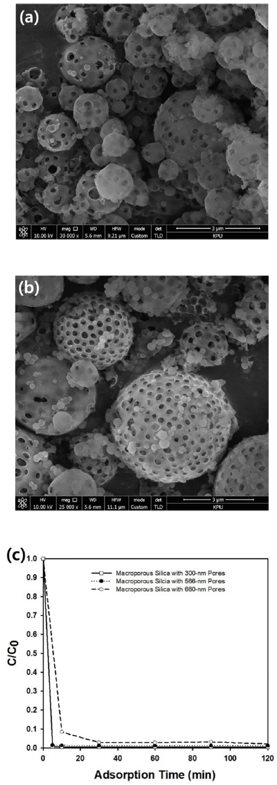 The macroporous or meso-macroporous silica microparticles shown in Figure 2 were used as an adsorbent in batch adsorber to remove the model contaminant, methylene