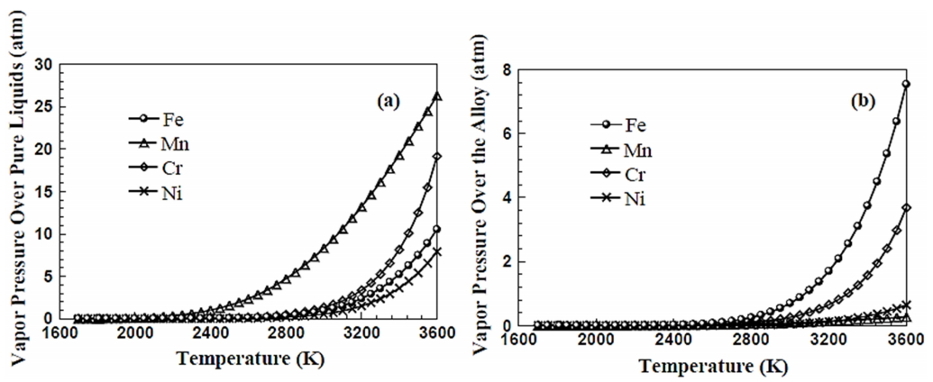 Vn은 기화 전방속도 (Evaporation front velocity)의 법선성분 (Normal component), V0는 응축상 (Condensed phase)의 음속 차수 (Order of speed of sound)인 상수, 내부 에너지 U= MLv/kB이며, M은 원자질량, Lv는 기화 잠열 (단위 질량당), kB는 볼츠만 상수이다 [19]. 그러나 기화는 단순히 온도에만 의존하는 변화가 아니다. 예를 들어 재료의 기화점과 융점이 반드시 비례하지 않으며, 합금의 용융에서는 원자 간의