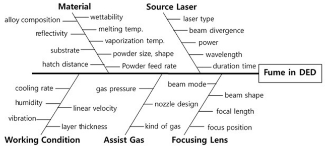 [53]. 이 방출된 고온의 나노입자들을 흄 [56]이라고 부르며, 대기와 만나는 과정에서 쉽게 산화물, 질화물로 바뀐다. 흄은 인체 뿐만 아니라 레이저 반응과 DED 품질에 큰 영향을 미치기 때문에