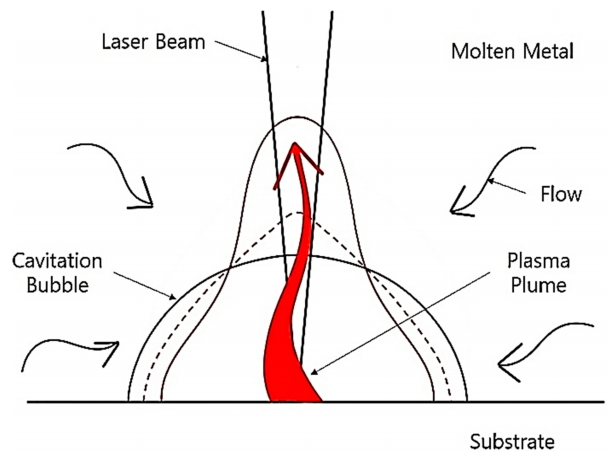 의해 생성되는 유체의 이동속도가 빠를수록 융액의 증기압은 낮아져 캐비테이션 버블이 생기기 쉬워진다. 실제에서는 레이저 빔의 이송속도가 빨라지면 유체