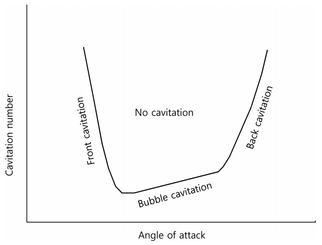 식 (4)에서 받음각의 일정 범위 내에서는 캐비테이션 수가 증가해도 캐비테이션이 쉽게 일어나지 않는 비캐비테이션 영역이 존재한다. Tupper는 캐비테이션수와