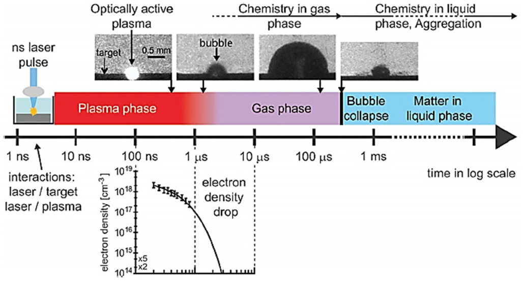 Stauss 등의 연구에 의하면, 레이저 조사 후에 캐비테이션 버블이 가장 크게 팽창한 때에 나노입자 핵이 형성된다. 시간이 지나면서 일부 나노입자들은