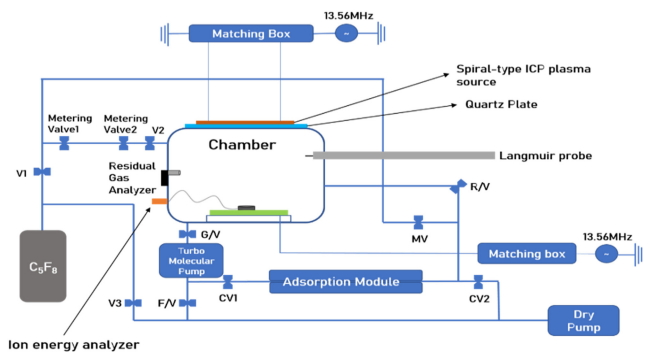 그림 1은 흡착 및 회수 모듈이 설치된 유도결합형 플라즈마 식각 시스템(ICP, Inductively Coupled Plasma system)의 개략도이다.