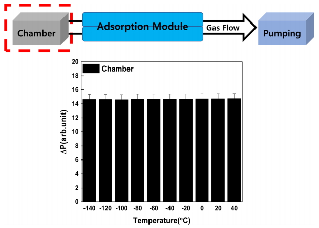 바라트론 게이지(Baratron Gauge)를 통해 흡착 모듈의 압력 변화를 관찰하였다. 설정된 공정 압력에서 챔버의 압력은 온도에 관계없이 거의