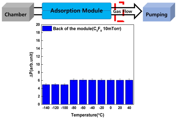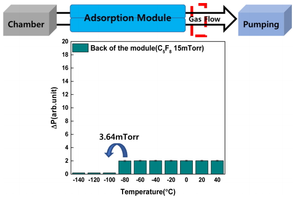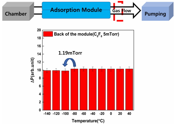 질소를 주입하며 히터를 동시에 가동시켜 흡착 모듈의 온도를 -200 °C부터 200 °C까지 제어할 수 있었다. 실험을 위한 공정 가스로는 C5F8을 사용하였다.