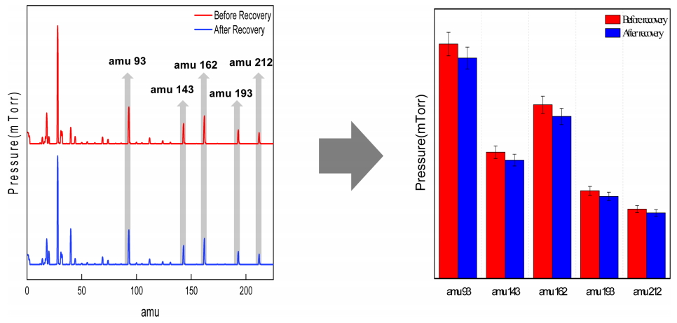 흡착될 경우 식각 가스의 재사용에 매우 큰 문제가 있을 것으로 예상된다. 그림4는 순수한 C5F8만 흡착에 의해 선택적으로 회수 되었는지 판단하기 위해 진행한 회수 전후 챔버내 잔류가스의 RGA 분석 결과를 나타낸다. 식각 가스의 흡착 및 회수