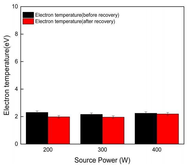 측정된 전자 온도와 플라즈마 밀도는 회수 전후에 거의 동일하다는 것이 확인되었지만 전자온도의 작은 차이로 인해 이온 에너지 분포가 바뀌면 플라즈마