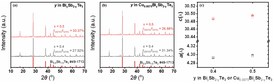 그림 1(a), (b)은 본 연구에서 합성한 CuxBiySb2-yTe3 (x=0, 0.0075, y=0.4, 0.5) 소결체의 XRD 분석 결과를 나타낸다. Cu를 첨가한 조성 및 Bi와 Sb의 조성비를 변경한 샘플들