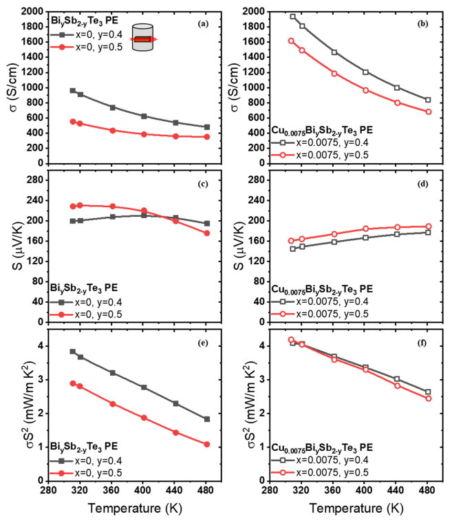 그림 2에서 Bi와 Sb의 조성비 변화와 Cu의 첨가에 따른 전기전도도, 제백계수 그리고 파워팩터의 온도에 따른 변화가 나타나있다. 먼저 Cu를 첨가하지