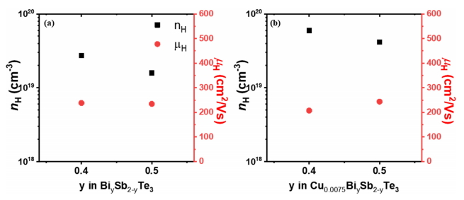 크게 증가하였다. 이는 첨가한 Cu가 Bi/Sb 자리에 치환되어 정공을 생성하였기 때문이다 (CuBi/Sb' h+) [10]. 이동도는 (x, y)=(0.0075, 0.4)의 경우 크게 증가한 전하밀도에 의해 다소 감소하였고 (x, y)=(0.0075, 0.5)의 경우