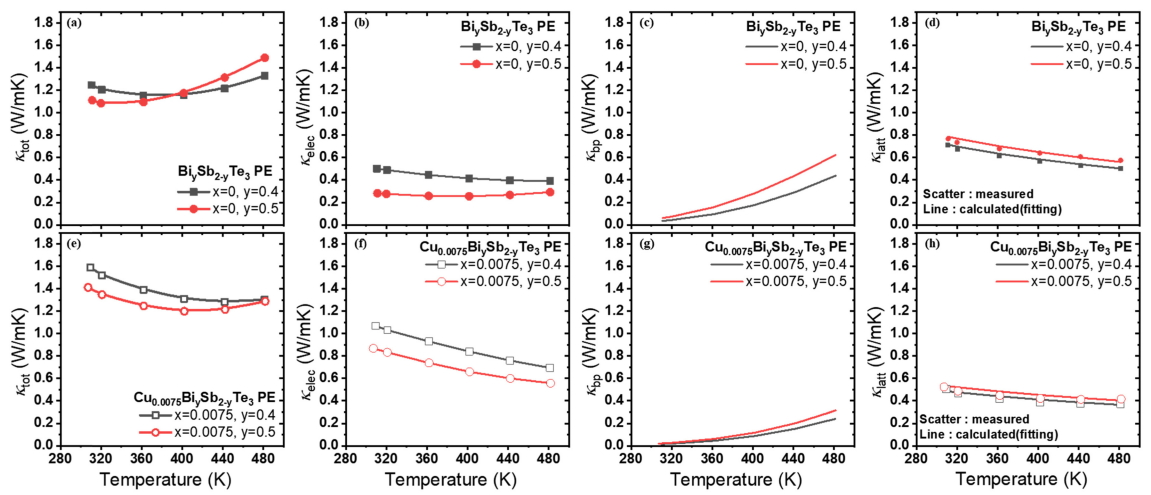 Cu의 첨가로 인해 점 결함이 형성되며, Bi와 Sb의 조성비 변화를 통해서도 격자구조 및 결함 변화에 의한 격자진동의 변화로 격자열전도도(κlat)가 감소할 수 있다. 그 원인을 규명하기 위해, 측정한 전체 열전도도(κtot, 그림 5(a), (e))로부터 전자기여분(κelec)과 양극성전도 기여분 (κbp)을 제외하여 κlat를 산출하였다(그림 5(d), (h)). κelec는 아래의 식(4)을 통해서 계산하였다.