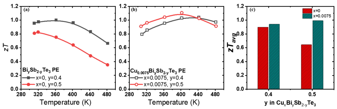 zT의 온도 의존성을 그림 6(a), (b)에 나타냈고 전체 온도 범위에서의 평균 zT를 그림 6(c)에 나타냈다. Cu0.0075Bi0.5Sb1.5Te3 조성에서 1.11의 최대 zT가 구현되었다 (400 K). 그리고 Cu 첨가에 의해 y=0.4, 0.5 조성 모두 평균 zT가 증대되었다. 그리고 전체 온도 범위에서 0.8 이상의 zT를 나타냈다. Cu가 첨가되지 않은 그룹에서는 y=0.4가 높은 파워팩터 값을 가져 y=0.5에 비해 평균 zT가 39% 높은 값을 갖는다. 따라서 Cu 첨가에 의한 zT 상승은 Bi0.5Sb1.5Te3 조성에서 극대화되었으며, 이는 Cu의 첨가가 (1) 전하밀도의 최적화, (2) 양극성 전도의 감소, 및 (3) 격자열전도 감소의 복합적인 효과를